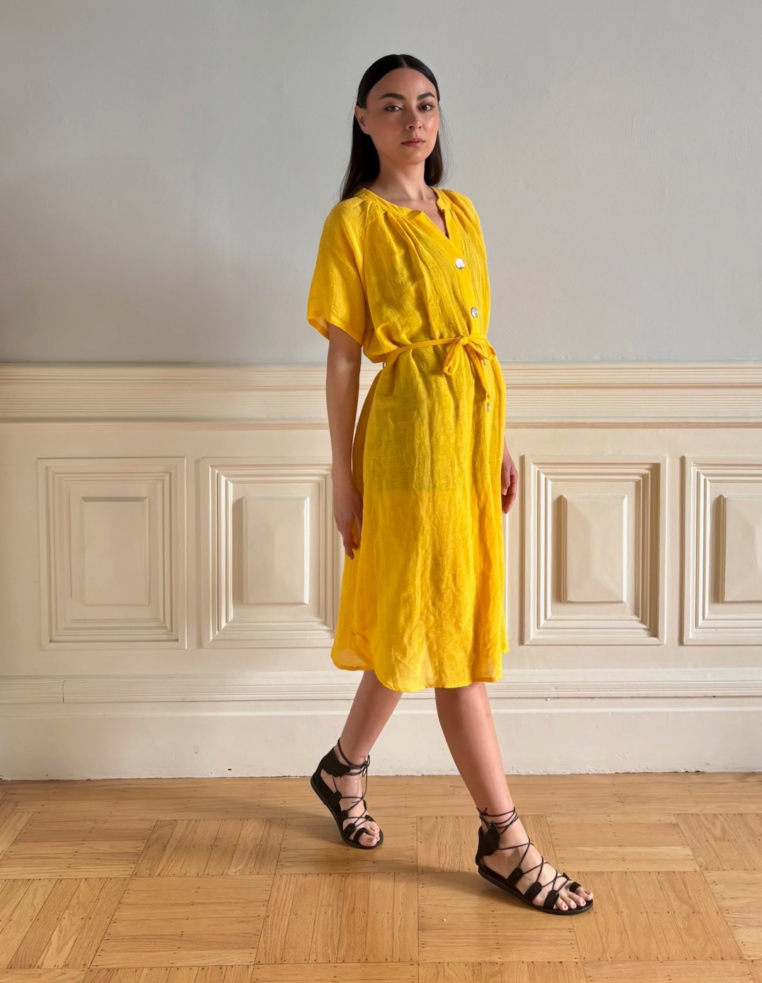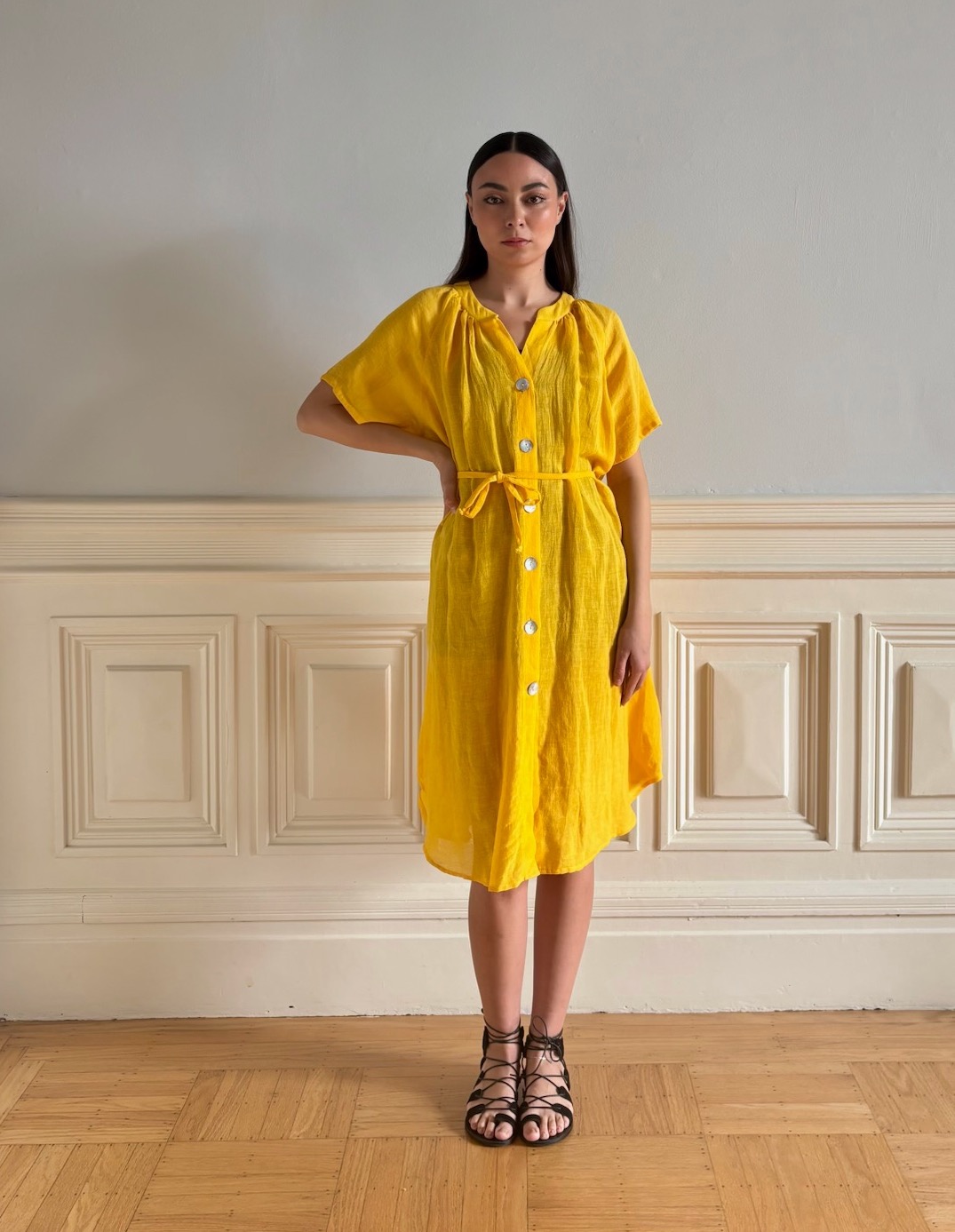 Crafted from airy linen in a vibrant sun-washed yellow, this button-front dress captures the ease and optimism of summer dressing. The relaxed silhouette is softened by a self-tie belt that can be worn loosely or cinched at the waist, while short sleeves and a gently curved hem add movement and lightness.