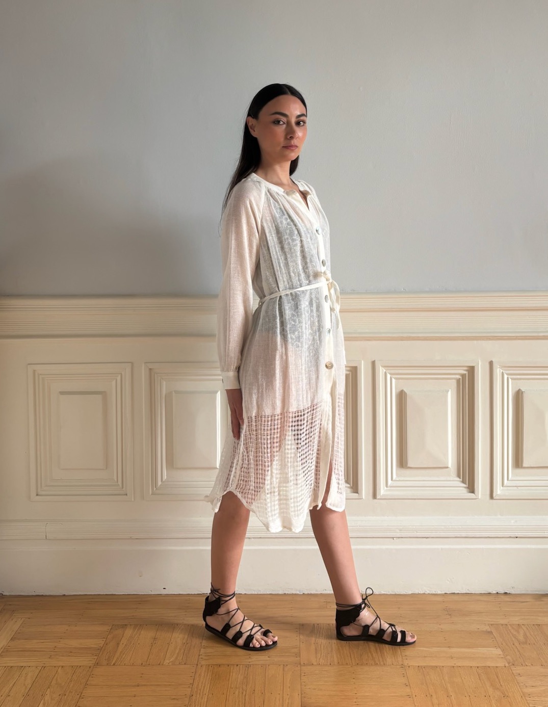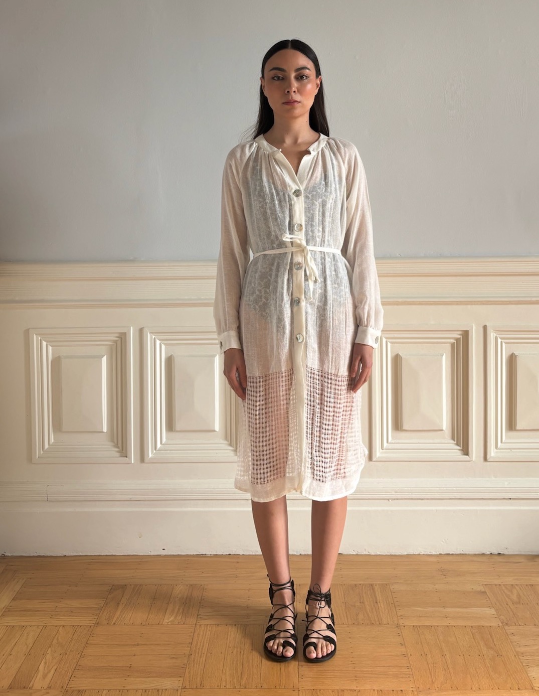 This long-sleeve white linen dress is a study in understated elegance. Cut in handwoven, lightweight linen, it features a clean button-down front and a slim self-tie belt that subtly defines the waist without disrupting the dress’s relaxed silhouette.