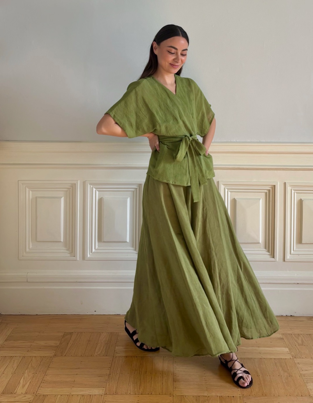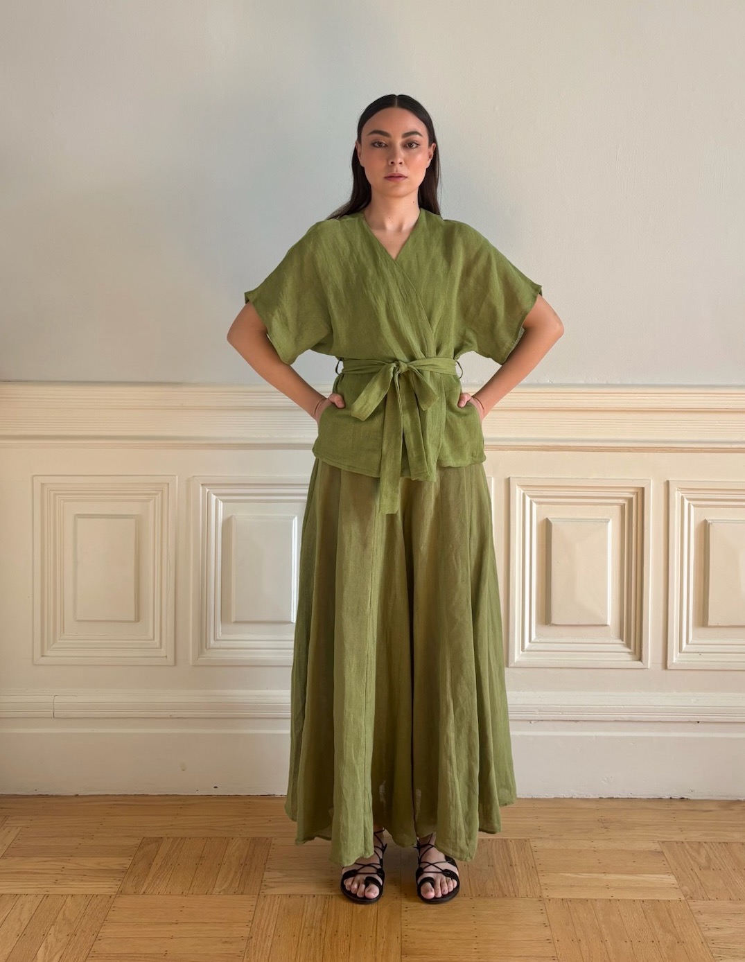 Cut from lightweight linen in a soft moss green, this short-sleeve vest balances ease and structure. The relaxed silhouette is gently shaped by a self-tie belt, allowing it to be worn loose and fluid or cinched at the waist for definition. A clean V-neckline and subtle sleeve drape give the piece an effortless elegance that moves easily from day to evening.